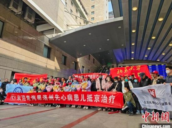 3月19日,來自青海省果洛藏族自治州的17名先天性心臟病患兒在家屬等人陪同下,乘坐火車抵達(dá)北京西站,將在北京的四家醫(yī)院接受免費手術(shù)治療。圖為接站現(xiàn)場。中新社發(fā) “同心·共鑄中國心”組委會供圖