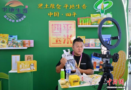 8月15日,吉林長春,商家在農(nóng)博園內(nèi)直播售買玉米。當(dāng)天,第二十四屆中國長春國際農(nóng)業(yè)·食品博覽(交易)會在長春開幕。本屆農(nóng)博會集中展示中國最前沿的農(nóng)業(yè)科技成果,彰顯“大國糧倉”的科技實力,吸引眾多參觀者近距離體驗現(xiàn)代種植技術(shù)及優(yōu)質(zhì)農(nóng)產(chǎn)品。中新社記者 張瑤 攝
