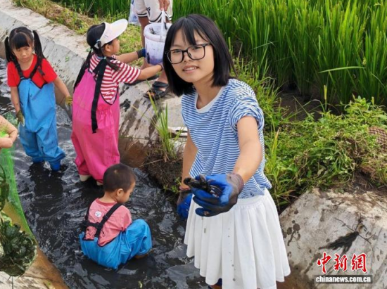 8月11日,2025年吉林省臺聯(lián)第五屆兩岸婚姻家庭親子夏令營走進吉林市,營員們在稻田體驗抓螃蟹。 黃子珊 攝