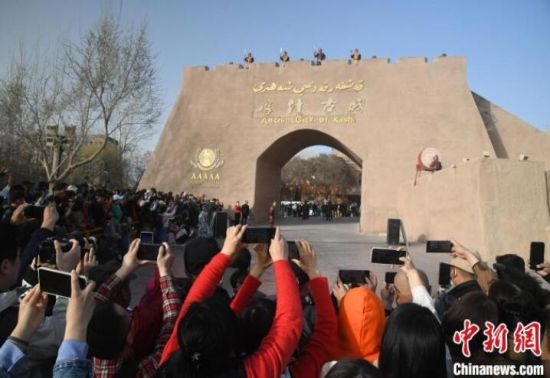 日前,中新社記者在喀什古城景區(qū)東門看到,三四百名游客共賞開城儀式。隨著音樂聲歇、舞蹈曲散,游客們從東門魚貫而入尋找“詩和遠方”,用相機拍一張“歲月靜好”的圖片,或者買些旅游紀(jì)念品送親朋好友。