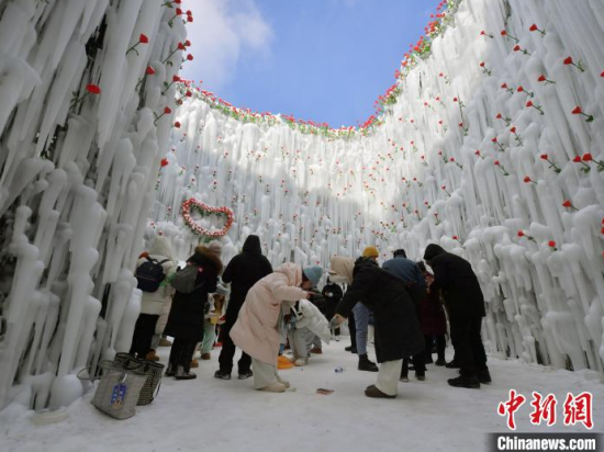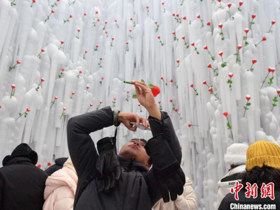 12月26日,吉林長白山,游客在冰洞內(nèi)打卡。進入雪季,長白山推出“愛心冰封玫瑰”吸引大量游客打卡拍照,冰洞內(nèi)被玫瑰道具環(huán)繞,洞頂呈心形,充滿浪漫氣息。