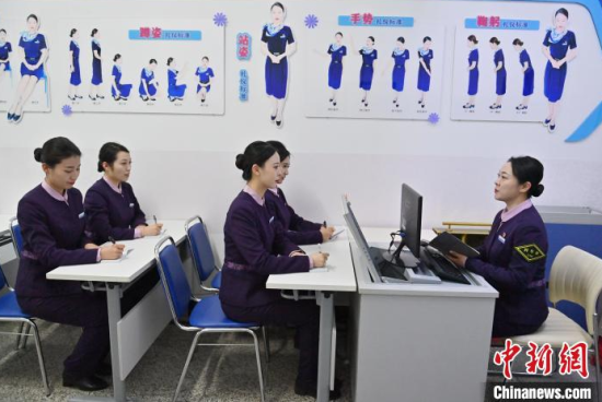 1月7日,吉林長春,“動姐”在進行安全知識培訓。春運臨近,為提升服務品質(zhì),沈陽局集團公司長春客運段動車一隊的乘務員們利用業(yè)余時間開展基礎禮儀、職業(yè)形象、服務技巧等內(nèi)容的培訓。中新社記者 張瑤 攝